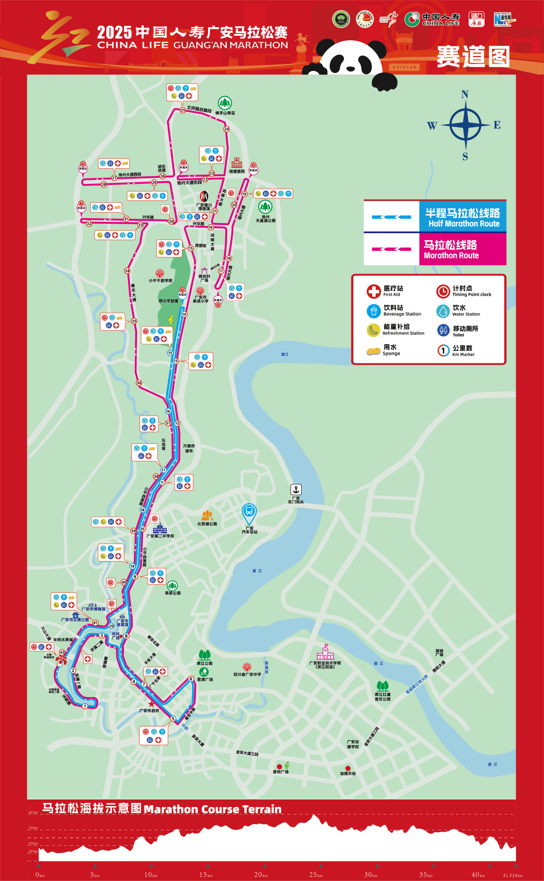 马拉松路线:广安賨城里—花水湾—锦屏花园—阳春桥—东阳滨江丽景—环溪一路—D号桥—富源街—环溪二路—金安大道—天府饭店—中桥—建安中路—思源广场—思源大道—金安大道一段—市民广场—加州阳光—市融媒体中心—乐活城—故里南门—小平干部学院—兴华路—福兴大道—圣雅山庄(折返)—福兴大道—东环路黄水洞段路口(折返)—福兴大道—兴华路—鸿锦大道—协兴大道东段牌坊路路口(折返)—鸿锦大道—北环路战旗段—牌坊路—协兴大道西段—协兴大道西段小平大道路口(折返)—牌坊路—兴华路—兴华路小平大道路口(折返)—兴华路—春天大道—牌坊路—狮子山街—狮子桥—市博物馆—文博公园—广安賨城里。